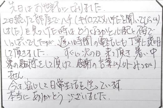 先日はお世話になりました。2日続けて部屋でハチ(キイロスズメバチだと聞いてびっくりしました)を見つけた時はどうなるかと心配と不安でいっぱいでしたが,遅い時間の電話にも丁寧に説明して頂きました。すぐに次の日来て頂き,暑い中巣の駆除をして頂けて,感謝の言葉以外みつかりません。今は安心して日常生活を送っています。本当にありがとうございました。